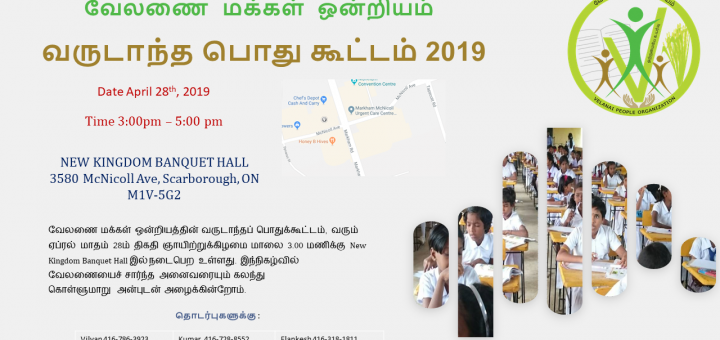 வேலணை மக்கள் ஒன்றியதின் வருடாந்த பொது கூட்டம் ஏப்ரல் 28ம் திகதி ஞாயிற்று கிழமை மாலை 3:00 மணிக்கு New Kingdom Banquet Hall இல் நடைபெற...